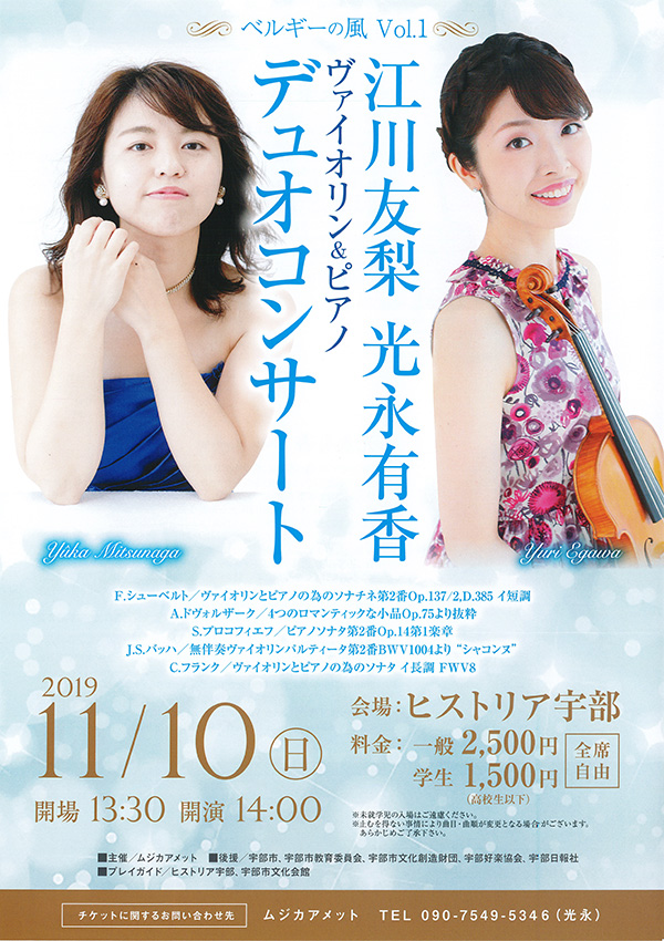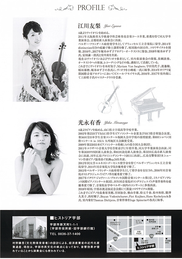 今回、ヴァイオリニストの江川友梨さんとともに、地元宇部でのコンサートだそうです。